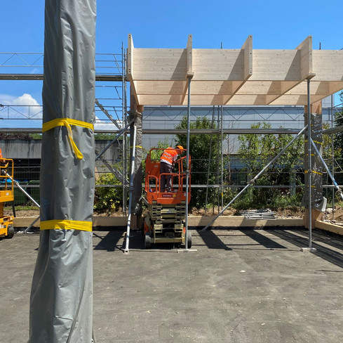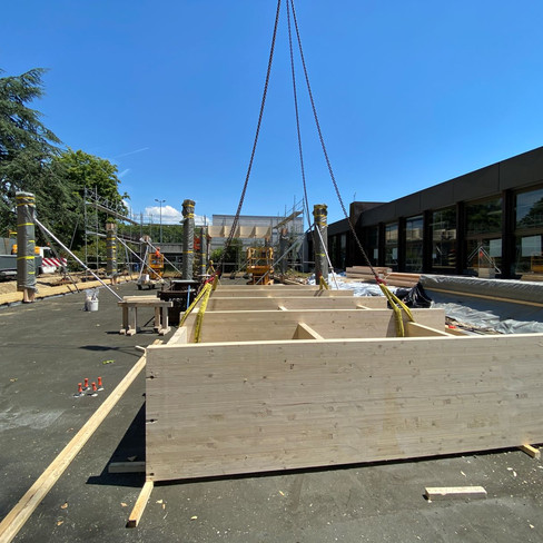 Mené en collaboration avec le Laboratoire d'architecture et technologies durables (LAST) de l'EPFL, le projet de construction d'un pavillon de Smart training a trouvé sa place entre les deux salles omnisports du site de l'UNIL à Lausanne. Le montage de la structure primaire en bois a débuté le 10 juillet pour une durée de deux semaines. L'entreprise adjudicataire JPF-Ducret SA est en charge de la fabrication (en partie préfabriquée) et de la pose de l'ensemble de la construction en bois (structure, enveloppe, façades et aménagements intérieurs).